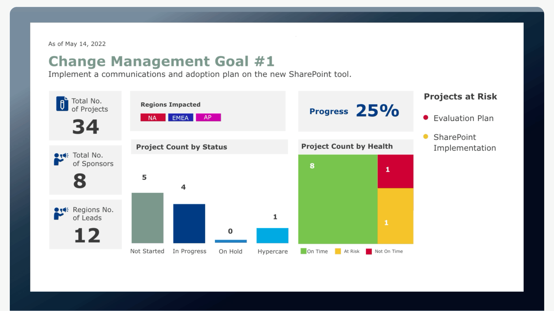 - Custom Dashboard: Visualizes project status, timelines, and ownership using SharePoint data.